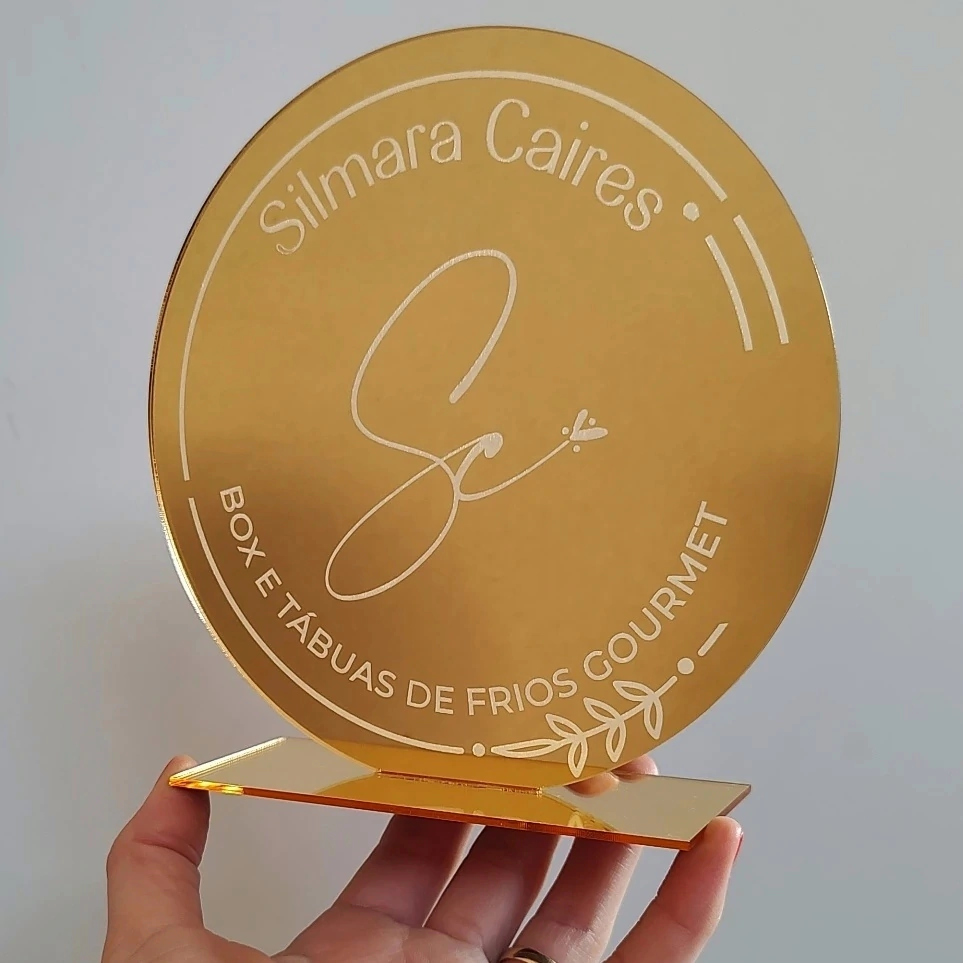 Feita em acrílico espelhado com gravação, disponível nas cores bronze, dourado, prata e rosê espelhados, e no acrílico transparente.