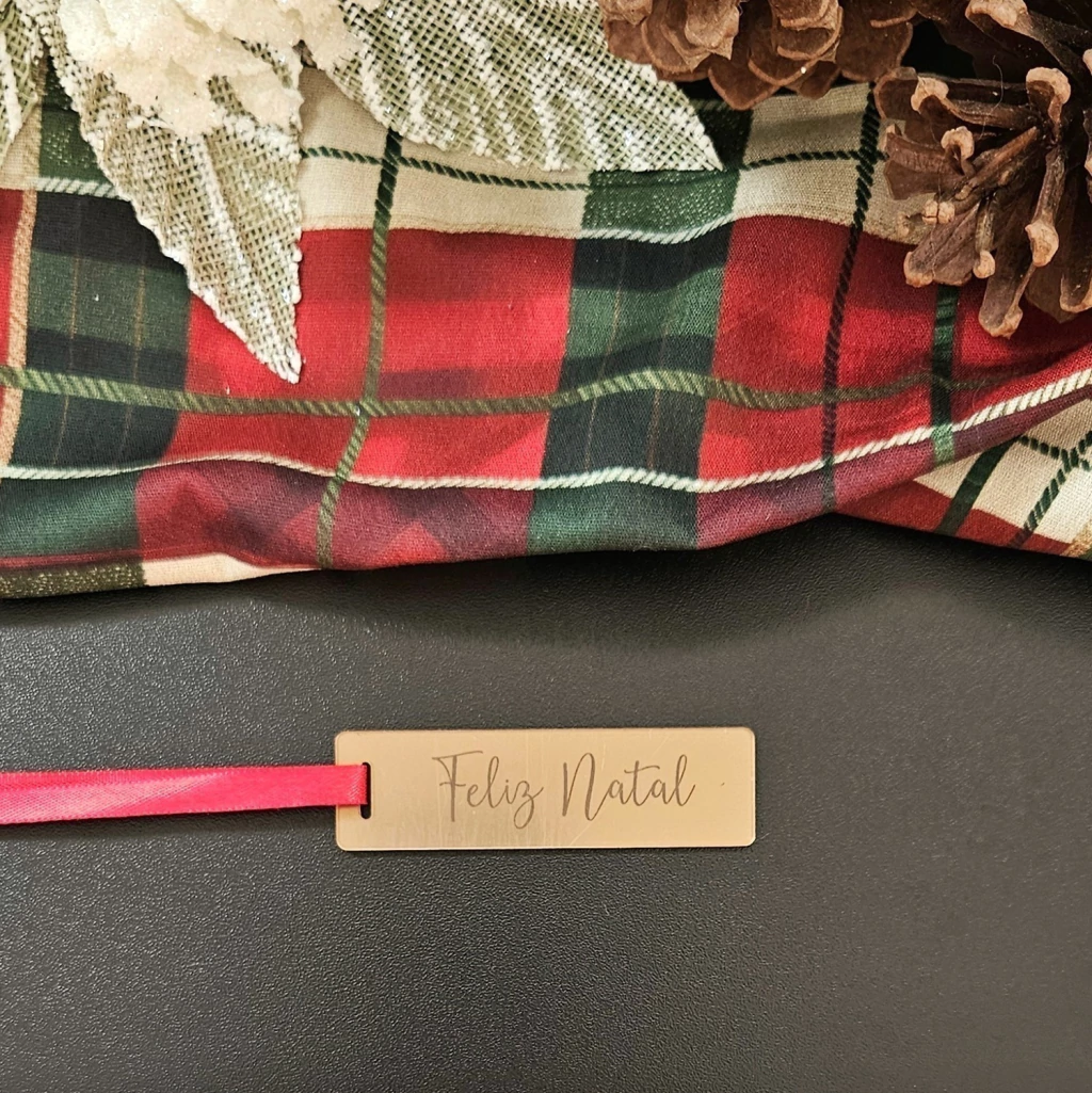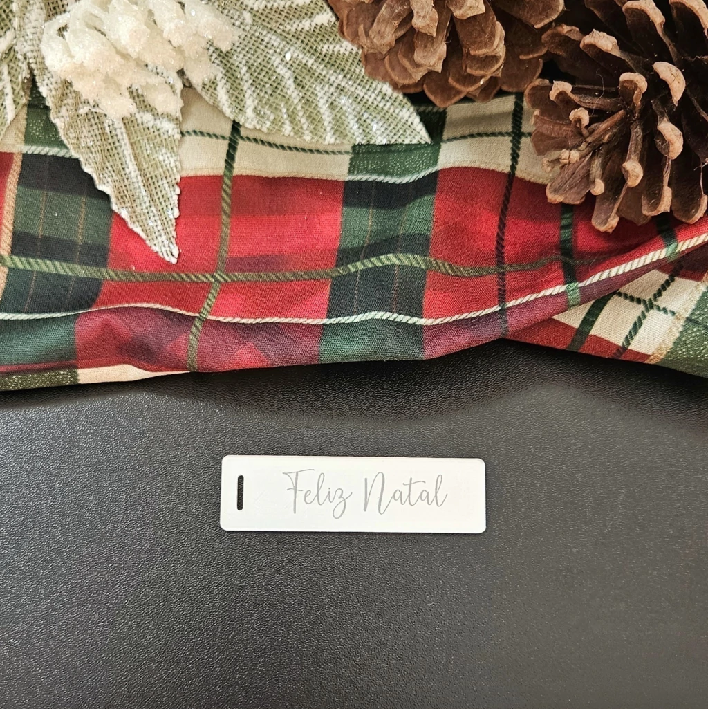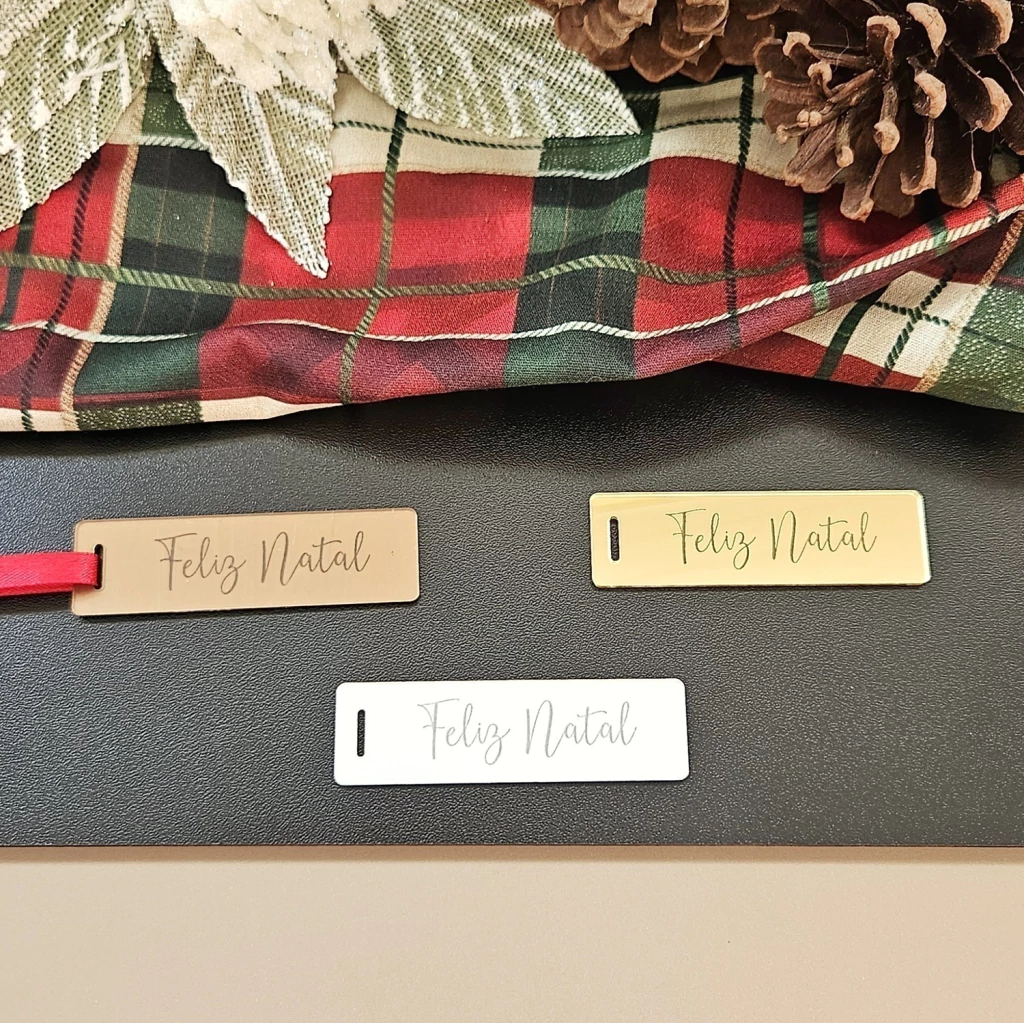 Tag em acrílico espelhado com gravação Feliz Natal.